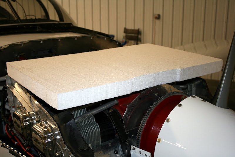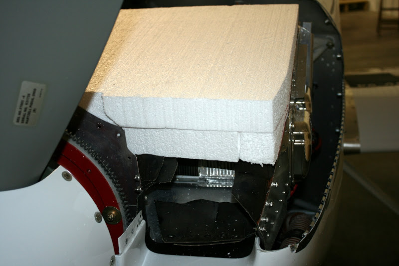 I started with a sheet of 2" stryo from Aviation Depot and started shaping with a surform and 40grit paper. The goal was to have the plenum fit inside the standard baffles and use the same holes for mounting.