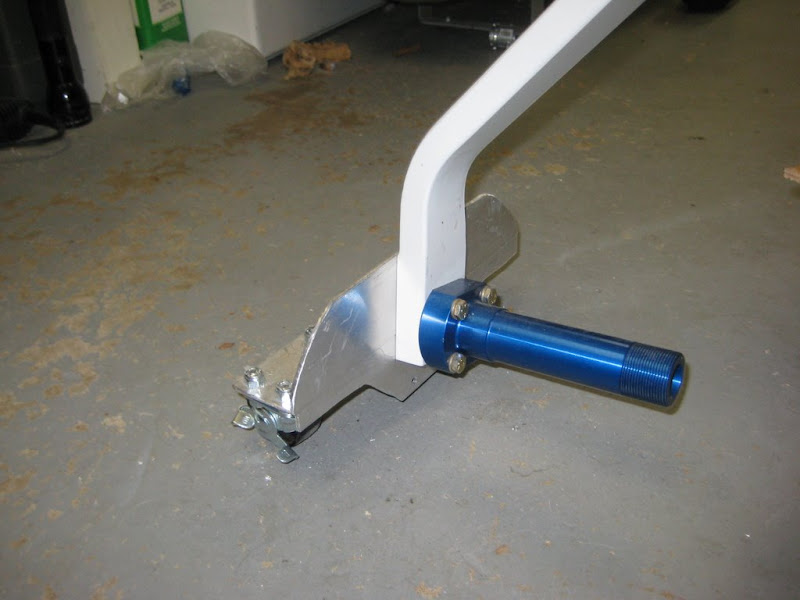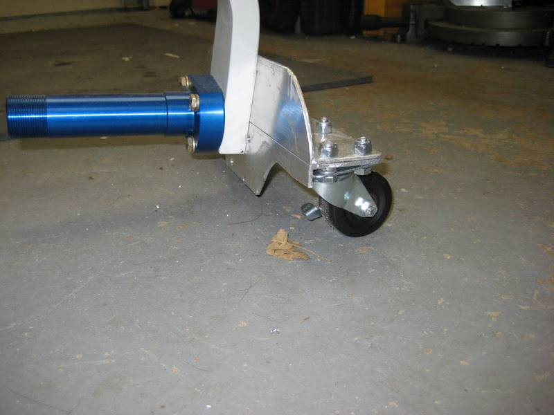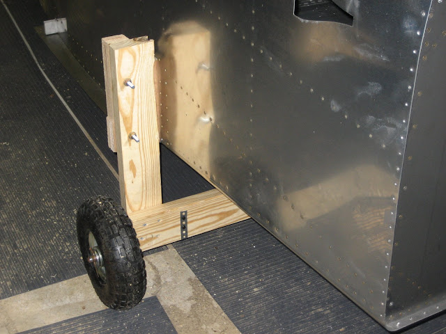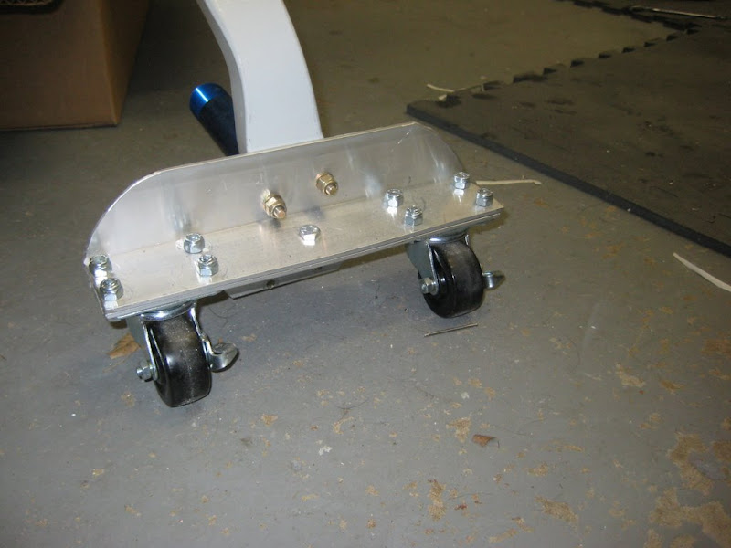 This looks an awful lot like an early version that I had before I mounted the engine. Those Harbor Freight wheels are rated for only 300 pounds each however so I "doubled up" per side for the heavier RV-10. A short 5/8" thereaded rod connects the two wheels on each side.