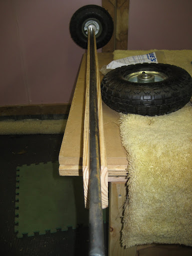 2x4 with a slot cut out for the 5/8" axle to fit in and 2 hand truck wheels.