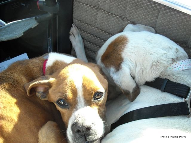 They took a potty break, I gave them some vet approved benadryl, and then it then was time to head out. Ron (orange hat) helped me load the dogs - Maverick immediately took charge up front while Fawn snuggled up in the back. I had the right seat removed and cushions on the floor.