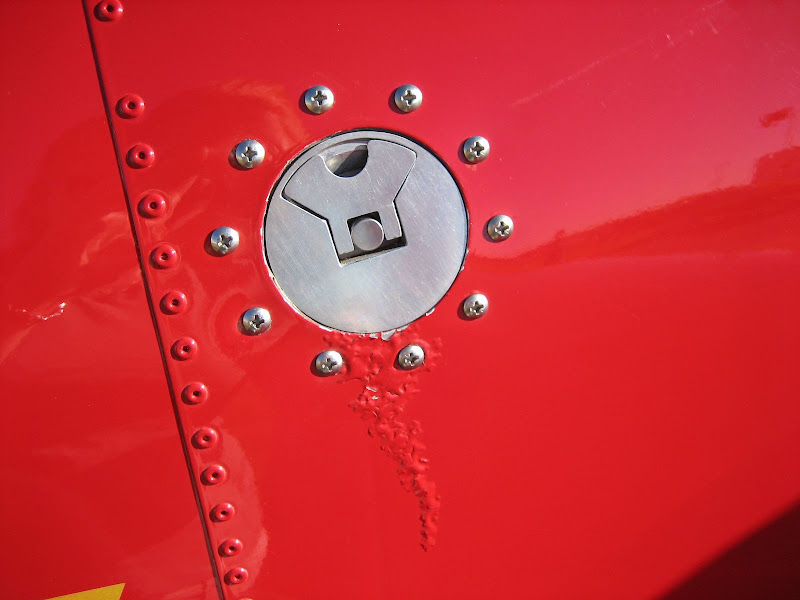 It's what happens when someone totally tops off the tank (and filler tube) on a cold winter day. Then pulls the airplane into a warm shop where it sits unattended for a long holiday weekend. Cold auto fuel (with ethanol) expands in warmth of shop and dribbles out cap vent keeping the paint wetted non stop for three days.