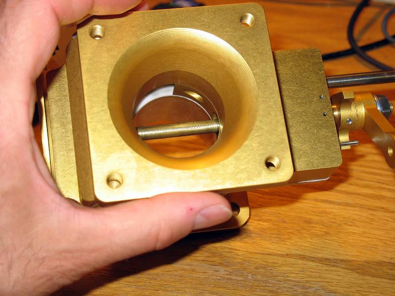 I'd be very curious to hear more about how others have set theirs up; it seems that the Ellison is highly sensitive to inlet geometry. Mine was bolted where the carb would go, with a ~1.5" spacer between it and the Vans FAB (there is a 1.5" difference in height between the MA4-5 carb and the Ellison). I mounted it with the slide parallel to the aircraft longitudinal axis, because this allowed use of the same throttle and mixture cables. Ben Ellison recommends mounting the slide perpendicular to the longitudinal axis, but gives no concrete reason why this should work better. Ken Krueger at Van's mounted his the same way I did, and reports good results.