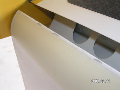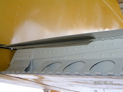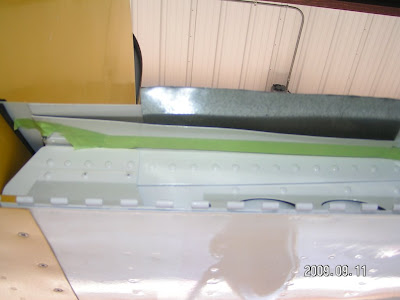 Here is the steel sheet in place and masking tape marking were to cut. Notice the plate-nut inboard for the wing root fairing, even though it sticks down, it never interferes with the flap.