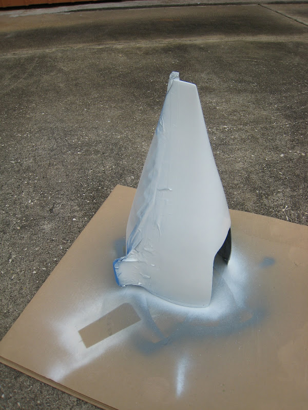 We arrived home about 1600, unloaded the camping gear, and off came the pant. I had a clean workbench, so getting started was simply a matter of grabbing a few grinding and cutting tools to “debreed the wound”, as the physicians might say. Lots of soap and water , acetone, and elbow grease cleaned things up to get ready for new glass. I was very lucky in one respect – the elaborate trim colors on the pant were untouched – all of the damage was in the white bottom half of the pant. My painter had previously given me the secret paint code for a commonly-available spray paint that perfectly matches the white of “Jet Glo” that he uses, so I was going to be able to do this myself. I carefully taped off the entire top of the pant, using electrical tape along the curving black stripe that delineates top from bottom. A couple layers of paper and tape, and the trim was sealed from damage.