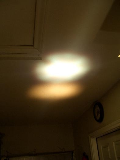 Here you can see the difference between the 55watt halogen and the 35watt HID. This is pointed at the ceiling of my garage. The HID kit actually draws ~40watts once warmed up and around ~45-48watts during startup.