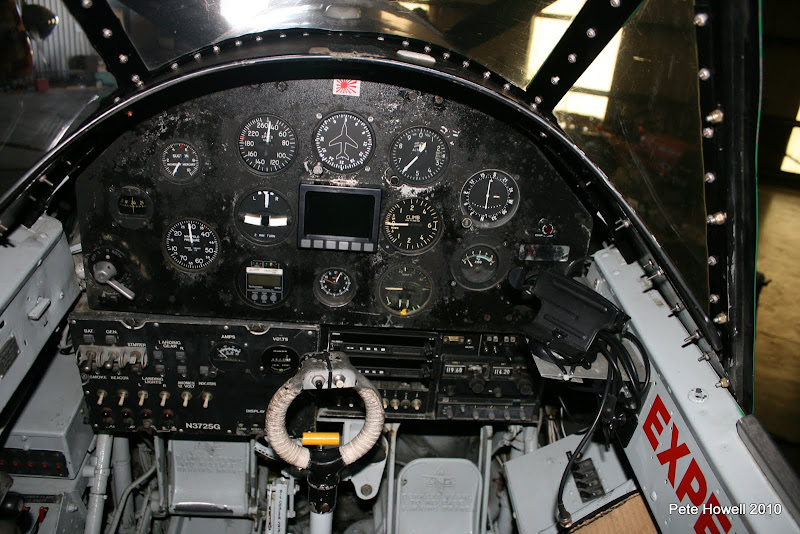 Second Stop - Muskogee, OK for gas and to meet one of Doug's airshow friends, Mike Anderson. Good airplane people there. I snuck in the hangar and found 2 warbirds - this is the cockpit of of an SNJ-5 painted in Japanese colors - I'm pretty sure the Dynon, the 396, and dual SL-40s are not historically correct, but very much appreciated by the pilots!