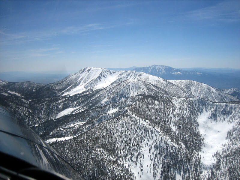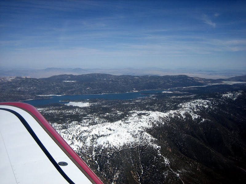 But today is grand and glorious here in the mountains, with visibilities in the hundred mile range, snow in the trees above 7,000 or so, and all of California spread out for examination. I launched in late morning to work the kinks out with a little Acro after all that straight and level, the cool mountain air giving back the lift you?d expect to lose at a density altitude of 7,000?. Light winds and no bumps ? does it get much better? Climbing out over the blindingly blue lake, I took a few pictures to remember the day ? ice in the coves, snow in the trees, skiers on the slopes ? and just over the ridge, the drop to the LA basin with green fields giving way to the brown and gray of endless civilization.