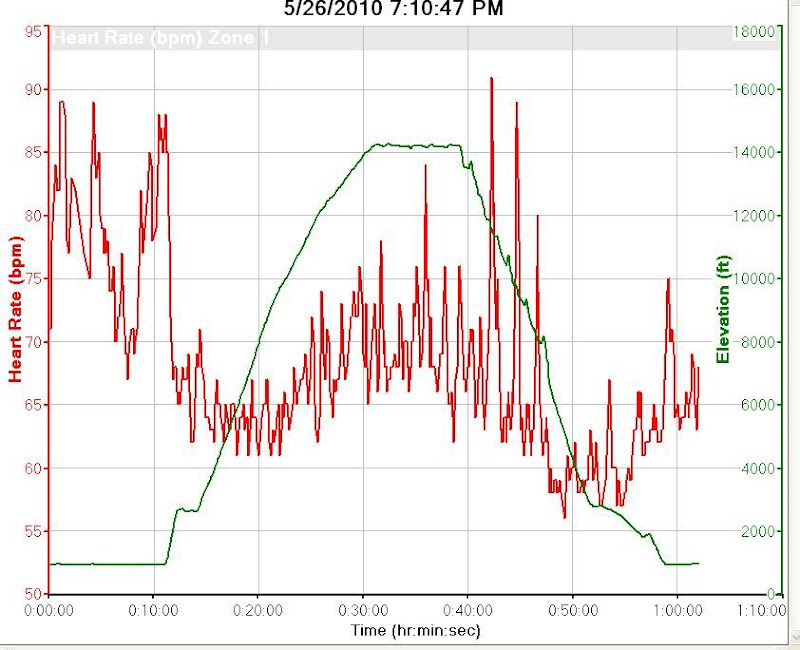 In your graph, if you draw a line across at 5,000', you can almost see a baseline range (if your throw out your initial "post push-out" rate)...call it 63-64 BPM. As you climb up and descend your HR goes up and then comes back down to that baseline in that same 5,000' (or so) range. I just thought that was interesting, as I've been taught in the past (not sure if it was Navy or another hi altitude effects class) that 5,000' is where night vision begins to deteriorate and the initial effects of lower O2 partial pressure are seen. Supp O2 is not yet needed, but 5K is what where the body starts to be impacted...or so the class taught. Just interesting to see your graph...might be a stretch (I wouldn't call it a scientific conclusion), and may not be repeatable, but its nontheless interesting. I would also guess that HR would go up under g, especially if you were doing any level of g straining maneuver (grunting, etc).