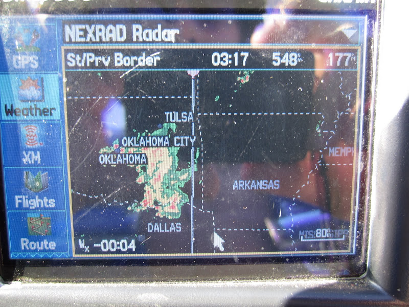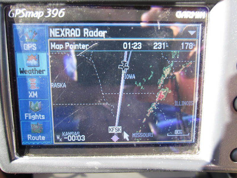 I didn?t keep the screen shots as Paul did. We took off Saturday morning into a 600? ceiling to depart for Kansas, and managed to get on top at about 5500?. We went north to Chattanooga to avoid all of the thunderstorms already in Alabama. We had a really pleasant trip out there, with a stop in Kennett, Missouri, which seems to have the cheapest fuel around ($3.59). Of course, the Southeast exploded into thunderstorms that afternoon, but we were safely gone by then.