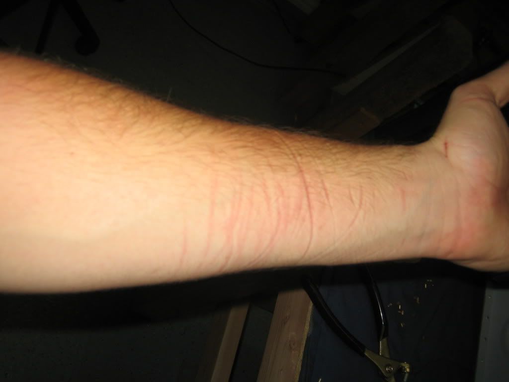 Good going...I wish I could have told you to wear a long-sleeved flannel shirt! It really makes a difference. Your arms don't look too bad, it's more common to see a bloody mess!