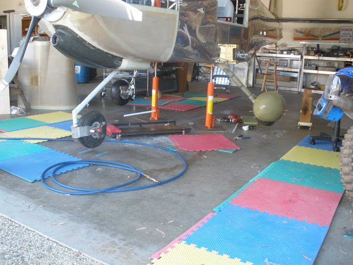 I'm assuming that jacking the plane up under the center section would be most appropriate. This will require a saw horse or stand of some sort on top of which I could use a couple bottle-type jacks pushing up on a ~4-ft 2x6 under the center section carry through. Trying to make this all stable, which might be a bit difficult given that everything FWF is on, is what I'm concerned about.