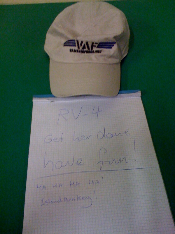 Here was a message from Bernie that I found on one of the tables in the workshop along with a VAF hat from Osh: