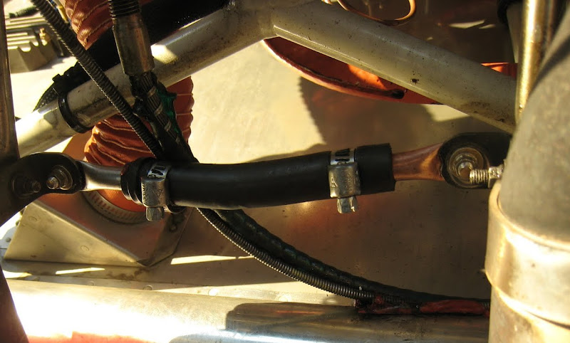 During my recent post-trip maintenance on the Valkyrie, one little problem I found was a broken end on the horizontal exhaust hanger. On the RV-8, you have two links that angle back and down from oil pan bolts to support the exhaust pipes, and one cross-brace that holds them apart. Each of these three links is made from a piece of reinforced rubber hose and two ?ends? made from a piece of 3/8? stainless steel tube with the end crushed flat and drilled.