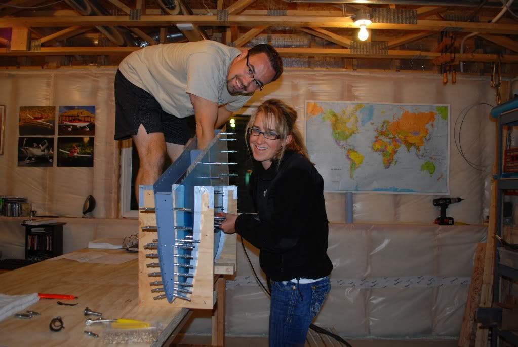 a rivet gun that is. Its official. My wife is my new riveting partner. After a some coaching from my building/pilot mentor Mr. Tom Berge Kari's curiosity finally got the best of her. I was working on my vertical stabilizer tonight and she asked, "Can I try that?" A little demo with the gun and she was off and running. We set the rivets in the front spar on the vertical tonight and she did very well. I am proud of her and also excited at the prospect of us working together on this.