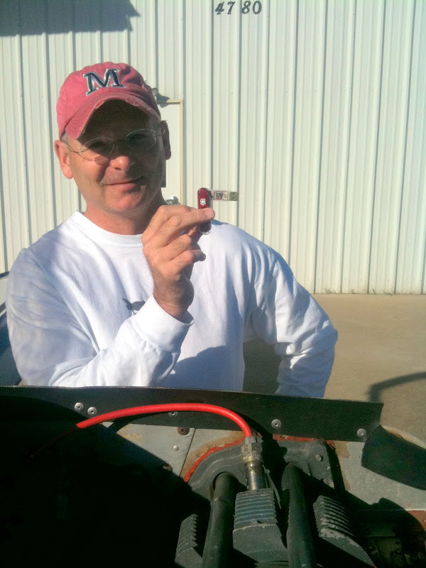 Isn?t technology amazing? Here we were, ?Mikey? and I , up at Northwest Regional Airport to get his prop balanced, and Doug was hanging around to take a few pictures. At one point, we needed a knife to cut a cable tie, and Doug whips out his Swiss Army Knife, complete with a 16 Gig flash drive. OK, so lots of folks have those these days?right? But what?s special about this one, the one Doug is showing in the picture? The ENTIRE Vans Airforce universe is backed up on that knife!! The web site, the forums, the archives ? EVERYTHING!! Heck, he?s probably got the entitre NOS library there as well?.