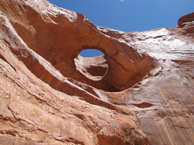 We over-flew the SAF VOR, turned North at CABZO intersection and headed toward Farmington, NM into a fierce 32 kt. head wind and toward RSK ?rattlesnake? VOR. With the Mattituck IO-360 purring, the foreboding terrain below didn?t seem quite so treacherous and we crossed many dry arroyos and countless washes, sand dunes, and rock outcroppings. It was interesting terrain to be sure. I envisioned the people that traversed this country a hundred and fifty years before and wondered what they would have thought about an RV screaming above them at 160 kts. I kept busy looking for roads and landing places should we need it. There weren?t many to choose from. We banked left at Farmington and headed into ever changing country, generally following the San Juan River until it turned further north. About the same time we came upon the Carrizo Mountains which we would pass just to the right of. I was very aware that high winds at altitude and rough terrain could spell turbulence and so I stayed a few miles from the mountain ridge. It wasn?t far enough. Up until now the ride had been a bit bumpy but nowhere near uncomfortable. Suddenly, the bottom dropped out and it felt as if a trap door had opened beneath us. The fall lasted less than 2 seconds and abruptly reversed. At the bottom, even with the 5 point Hooker harness fastened snug, my headset hit the canopy. That was the only time on the whole trip we hit bad turbulence. As we flew westward, the scenery became even more desolate and intriguing. Eventually, it took on an ?other-worldly? appearance. Mesas, spires, and ?monuments? began to thrust out of the ground. We had entered ?John Wayne Country?.