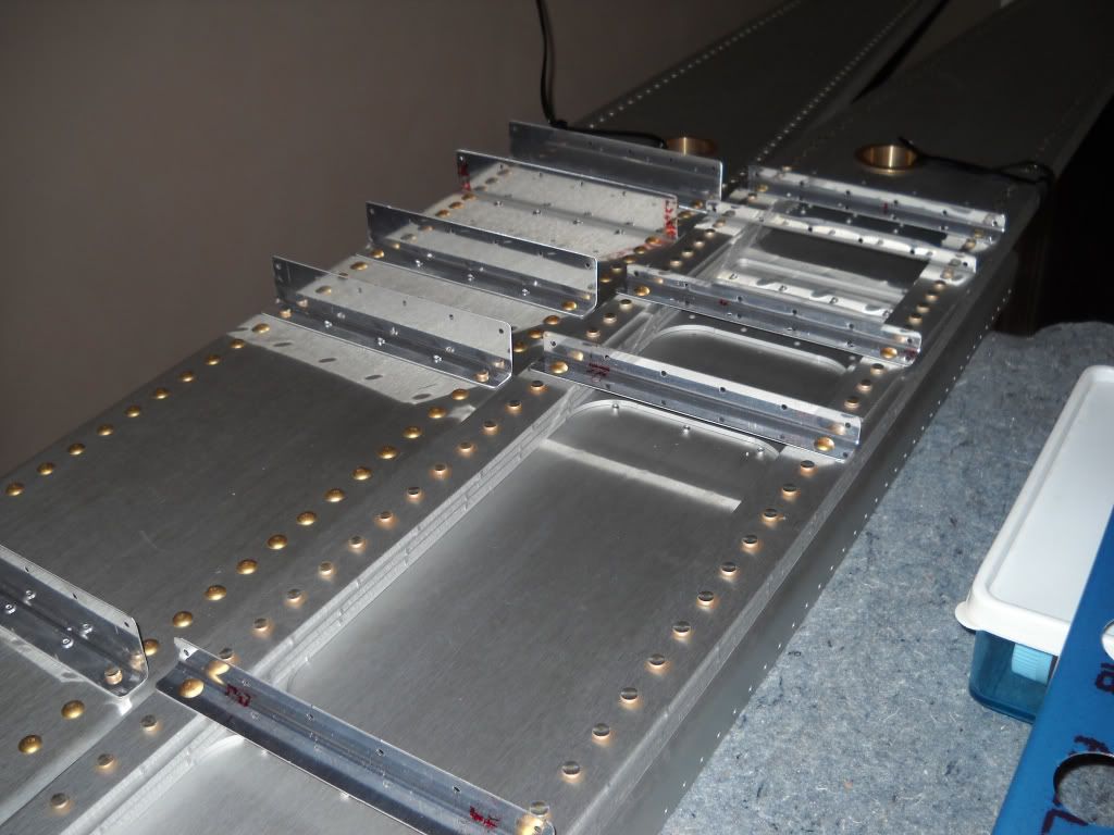 This is the forward face of the right and left spars. The forward ribs are attached to the angles. Note that the angles are of different lengths to allow the spar stubs to overlap in the fuselage.