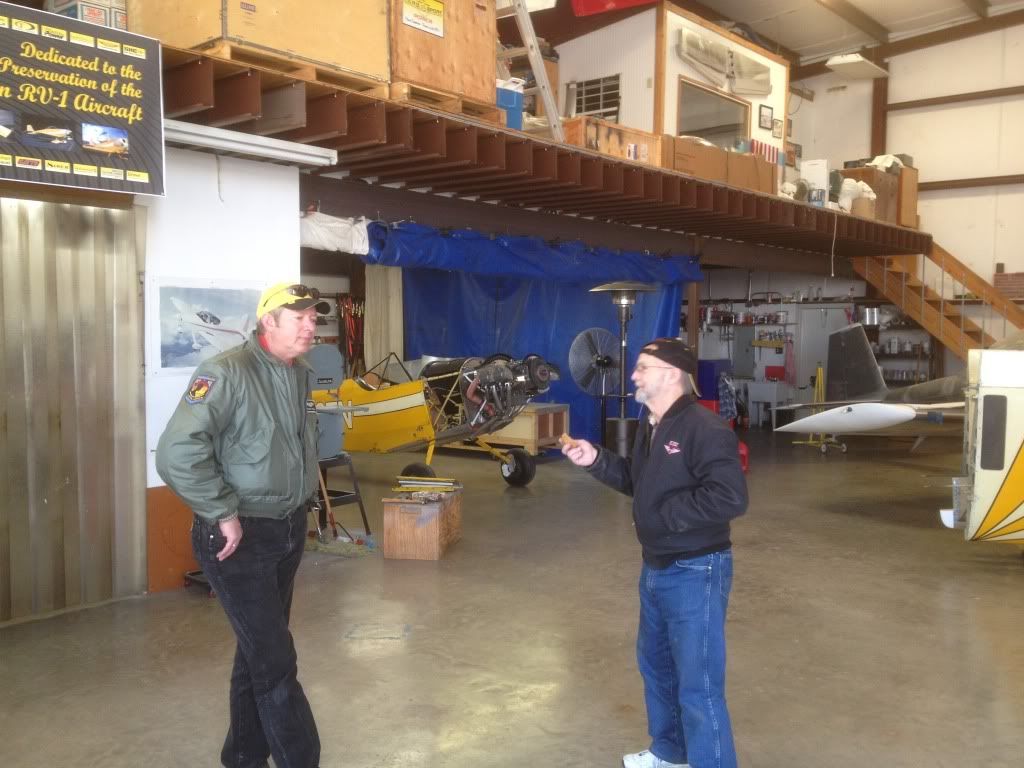Here is Boomer and Ernie discussing the wing we are about to put on the RV1 in Jay's nice shop. (RV1 is just between them)