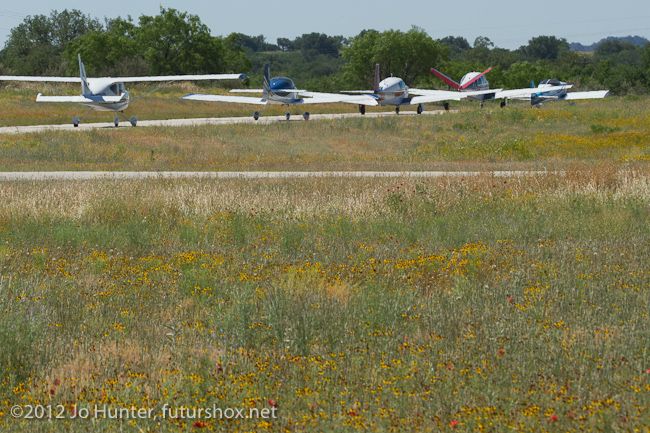 Short while later, I hear people calling turn 3, I?m searching the sky?. There above my alt is a white highwing, followed by a green mooney running lower. Drat! I?ve drifted to the inside and need to ?S? turn the corner to be outside and legal. It?s another left hand 2 g turn and start climbing for 4500. Gotta be a tailwind somewhere this direction. I pass well above the Mooney and call, "Passing the white highwing", a Glastar on his right side. As I go past it looks like they are backing up. Plane is running great, but can?t believe right tank is down to 7gallons(my minimum reserve for the race). Switch to left and hope I didn?t miscalculate. Turn 4 and I?m set up inside again?.should have prerun the course to identify the corners better. Another little S turn scrubbing seconds off the clock. The next turn or two are a blur, before I lower the nose over wishing the Llano bridge would get here sooner. A short dogleg to the airport and I cross the finish at the minimum alt of 2100? showing 191kts TAS. Whew that was quick.