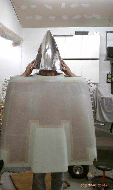 OK, maybe its not a Van's spinner, but a CF spinner from Mark's spare parts bin at Team Rocket...and maybe it was just serving duty as a nice mold to hold the inner portion of wrapped-around glass on the cowl extension I did to accomodate the change from a 12" Lyc spinner to a 13" Vans spinner (backplate on the Van's was about an inch narrower than the Lyc...made for a major gap to be filled!)
