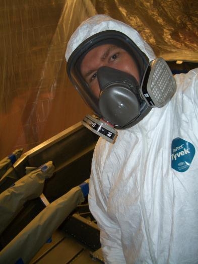 The big day has arrived on Sunday, it is time to paint. The weather has been great the last couple of days. A cold front came through and dropped the temp from 104 down to the low 80s, perfect for me to paint (or close enough). I started early and put together my paint booth by stapling plastic sheet to the ceiling and taping it to the floor. I have a couple of fans to circulate air through the "booth" with cheap filters to keep out the dust. I will be wearing a full-body tyvek suit and full-face mask with the appropriate chemical filters.