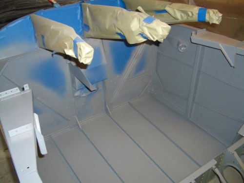 Last week I finished up the last few items I needed to do before painting and started in on the prep work. I stripped everyting out of the cabin that wasn't riveted in place. most of the parts are already primed with rattle-can duplicolor self-etching stuff from the auto parts store. I scuffed up the existing primer with fine sandpaper and green scotchbright pads to smooth the finish and remove any overspray dust. The interior (and the shop) was vaccumed and blown out with air. I wiped down the bare metal with acetone and the primed surfaces with a paint-prep I bought years ago at auto-zone. I masked off everything (that was lots of fun...).