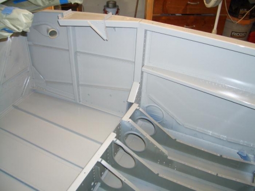II shot the grey epoxy primer. used the smaller touch gun with the rotating cup for most of the job, it is difficult to get in all the small areas and under the angles and stiffeners. I tried the full-size gun, but it was a bit much. The primer went on ok, but a little thick in some places. Next time I will thin the primer a bit. I let it cure for a couple hours.