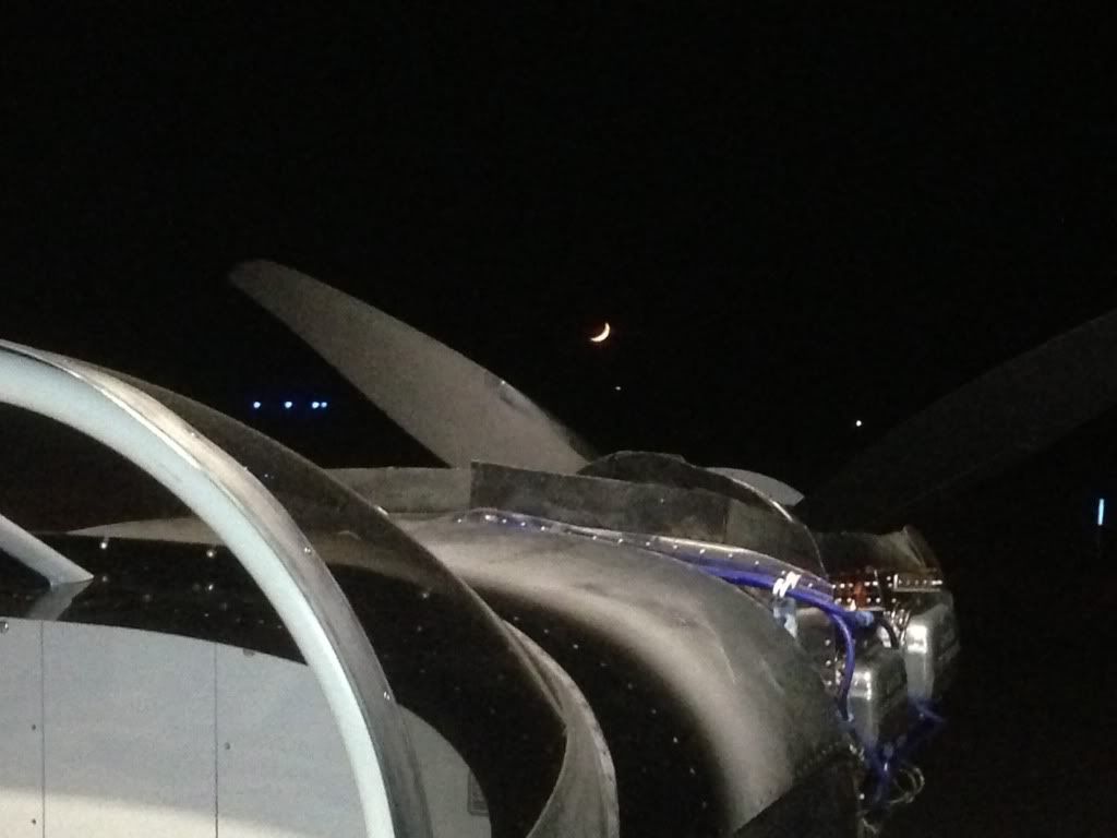 Kind of a crappy pic, the crescent moon through the prop and runway lights looked much better in person.