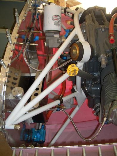 2) Just to clarify, the bulkhead fittings aren't the sole fixtures for the mounting bracket. The bracket is also riveted at the top to the firewall through the stiffener angle that runs horizontally across the back of the firewall. So the bracket is mounted to rigid structure, not just held to the thin sheet of the firewall by the bulkhead fittings.