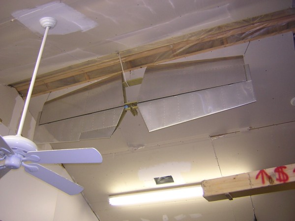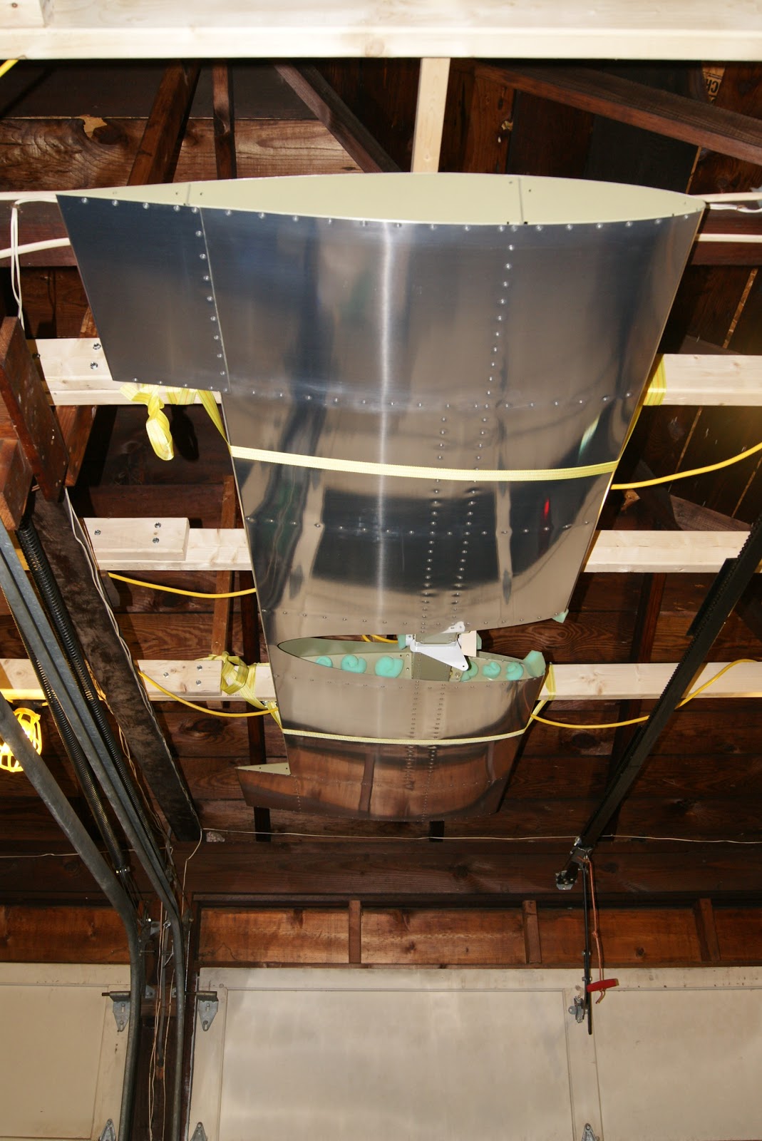 The stabilator is now DOG Aviation ?ceiling art? suspended from the rafters but above the garage door track. I?ve since added a protective cardboard shield underneath it.